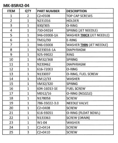 The Mikuni BSR42-04 carburetor rebuild kit contains all the necessary genuine Mikuni components to rebuild your OEM Can Am DS650 ATV carburetors. Includes genuine gaskets, O-rings, screws, and clips however does not contain any jetting. See the parts list and diagram below, ALL included parts are circled and listed. Model applications are also listed below.